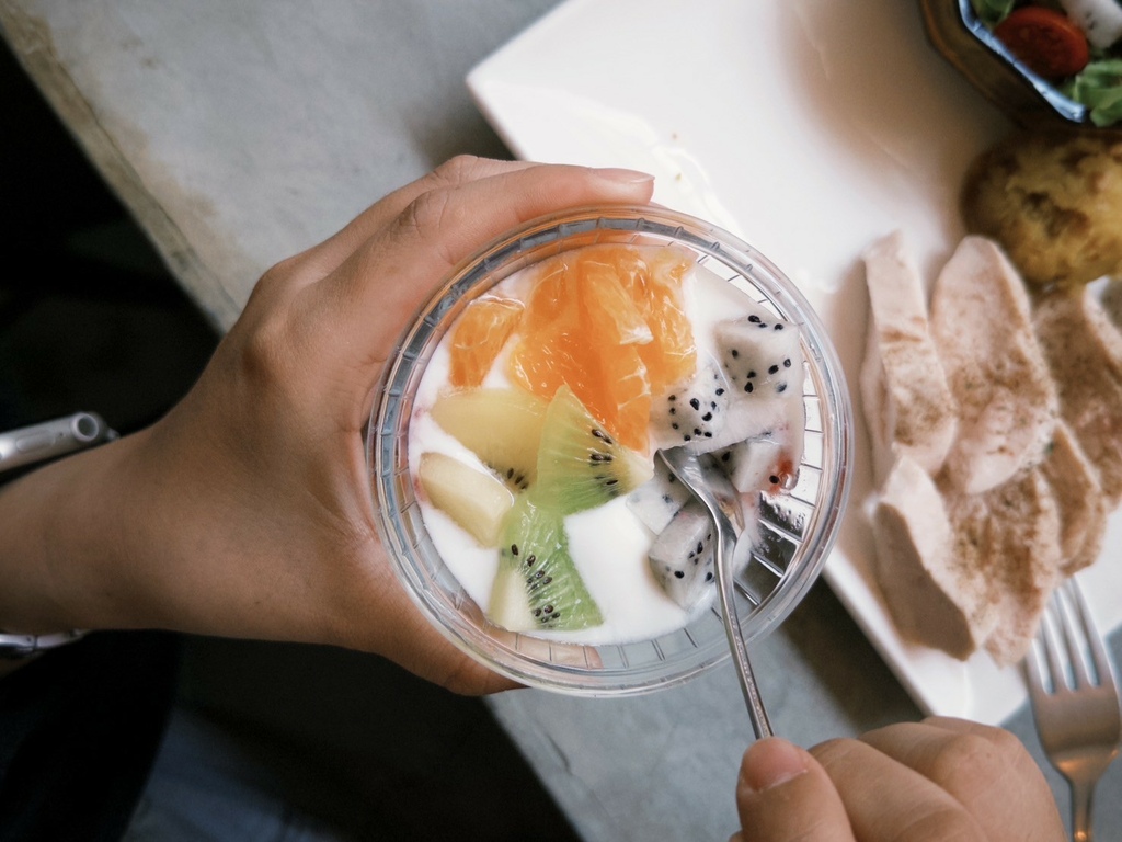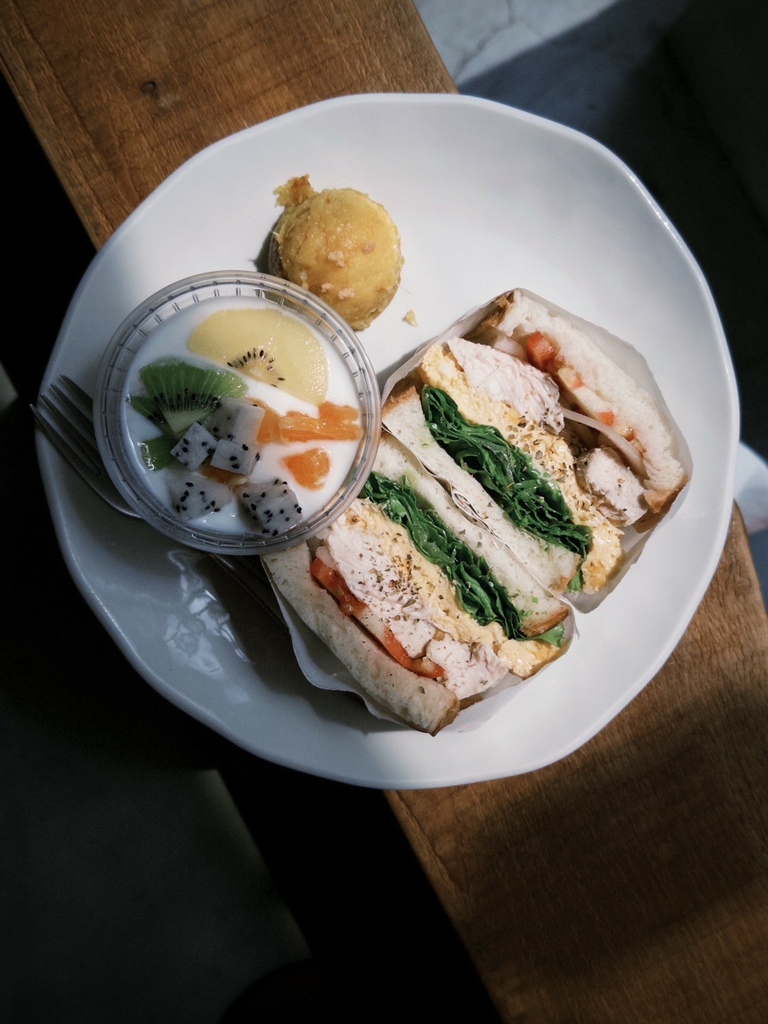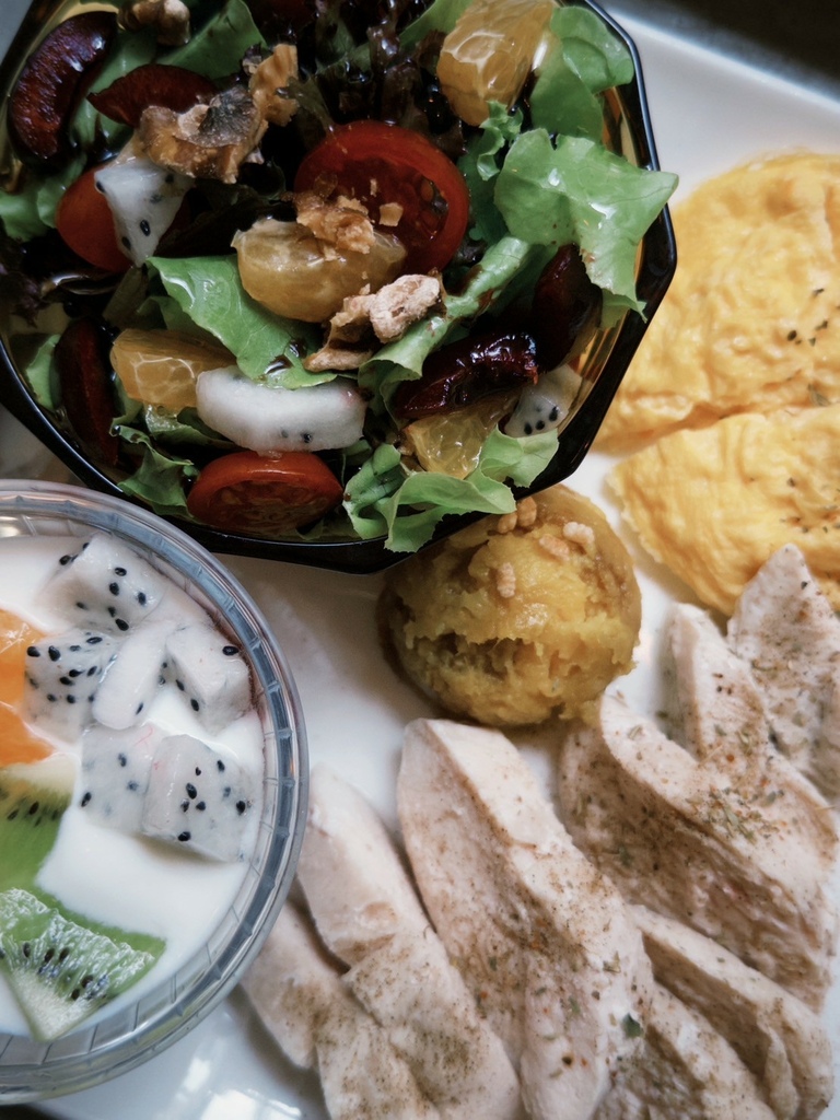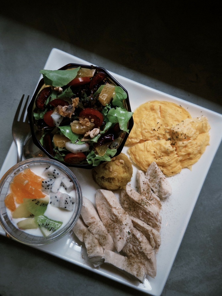 招牌餐盤包含舒肥雞胸肉、滑嫩炒蛋、新鮮蔬果沙拉與店家自製優格。